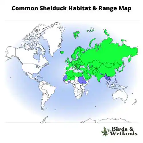 The common shelduck is a migratory species that breeds in temperate and northern regions of Europe and Asia. In Europe, it breeds and largely resident in countries such as the United Kingdom, Ireland, Denmark, and the Netherlands.