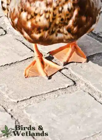 The four toes on a duck or goose’s foot are webbed, hence the term palmate feet. The front three toes are webbed together, while the hallux, or hind toe or fourth toe, is smaller and elevated. This type of foot configuration helps the birds swim well and walk on land.
