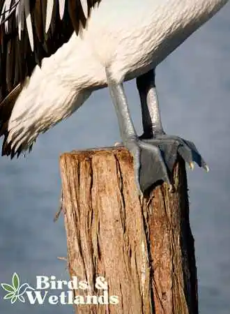 Birds have specially adapted webbed feet which they use to propel themselves through the water. When the bird pulls its foot forward for the next push, the toes fold and come together, folding up the webs to minimize resistance.