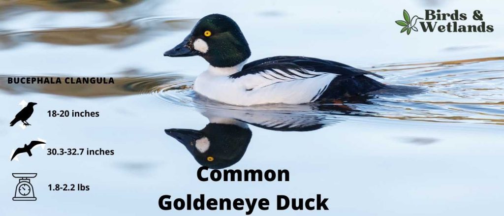 The Common Goldeneye Duck is a medium-sized diving duck that breeds across the northern hemisphere in North America, Asia, and Europe. It winters in the southern hemisphere.