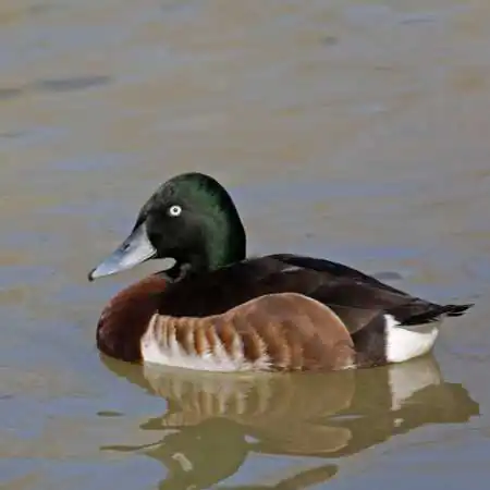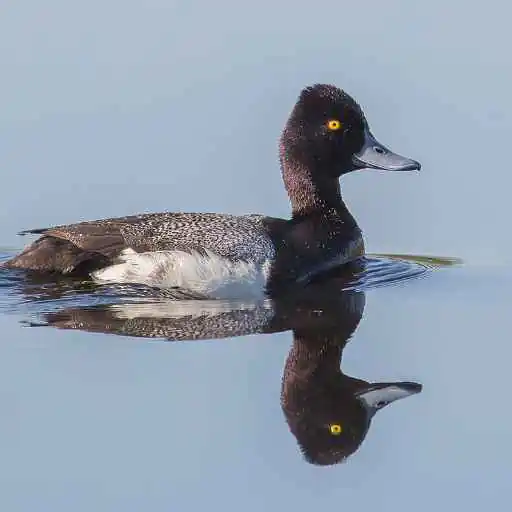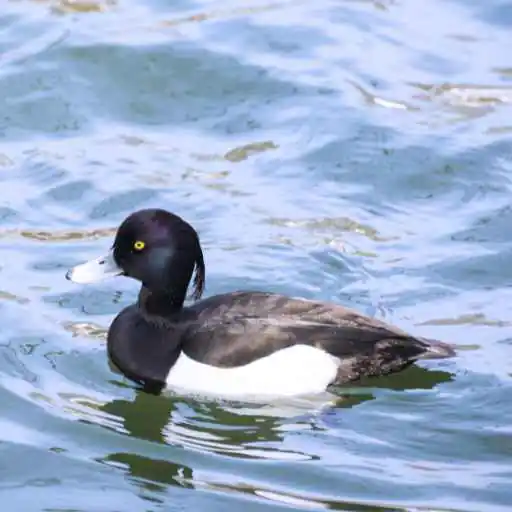 This duck is a small diving duck found in northern Eurasia, with a black body with white flanks, a blue-grey bill and gold-yellow eyes.