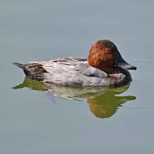 The common pochard (Aythya ferina) is a medium-sized diving duck with a distinctive triangular head shape. Males have a red head, black breasts and grey back, while females have a brown head and body with a narrower grey bill-band.