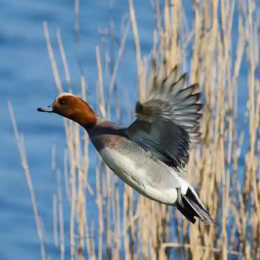 The Eurasian wigeon is a bird of open wetlands, feeding by dabbling or grazing and nesting on the ground near water and under cover. It is highly gregarious, forming large flocks, and is a noisy species that can hybridize with American wigeons in the US.