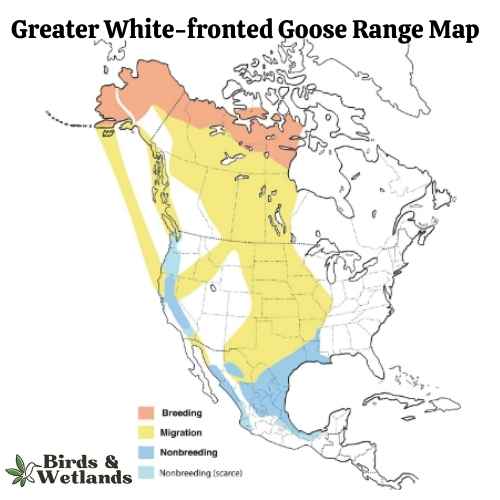The Greater White-fronted Goose is native to the northern hemisphere in North America and Eurasia. Their breeding grounds are found in open areas such as grasslands, marshes, wetlands, taiga, arctic tundra, alpine meadows, pond edges and lakeshores during the summer months and migrate south for the winter.