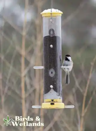 One of the best feeders for chickadees is the caged tube feeder. These feeders protect the seeds from other birds and help to reduce waste. A caged bird feeder offers a safe bird-feeding station for chickadees and many birds because it keeps other birds out except for small birds like chickadees. It also has multiple perches and openings, allowing chickadees and other birds to access the seeds inside easily.