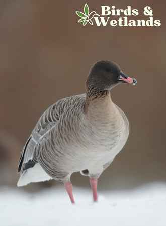 The lower neck and breast of this short-necked goose are paler brown, and the flanks are darker brown with blackish-brown vertical streaks. An additional white line runs along the upper side, connecting to the goose’s white rump and belly. It has a short bill that is bright pink in the center with a black base and tip, as well as pink legs and feet.
