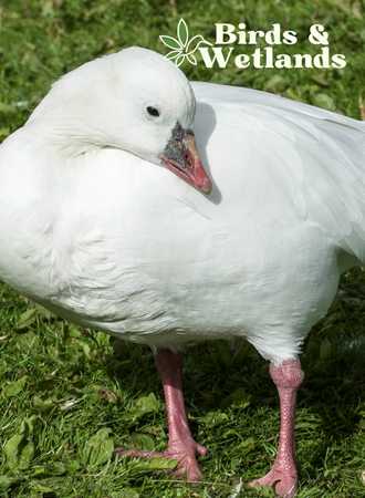 An adult white morph of Ross’s goose is a small, all-white goose with black wingtips and pink legs. Its stubby pink bill has a bluish-gray base, which helps to distinguish it from other whitish waterfowl more commonly found in its habitat.
