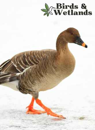 The tundra bean goose is a striking bird with attractive, distinctive plumage. Adults have orange legs, dark brown heads and necks, with paler brown mantles that are decorated with pale-edged feathers in a large-scale pattern. It has a thick, short bill. They are closely related to a separate species of geese — the pink-footed goose and the Greylag goose.